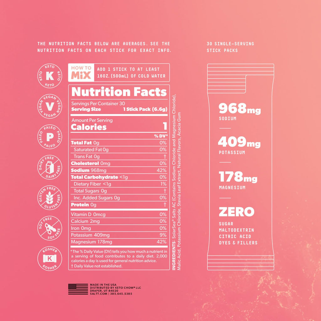 - Straight From Nature - SALTT electrolytes are sourced locally from Utah's Great Salt Lake, where trace minerals can be found in their ionic form. No sugar, no caffeine, no dyes. Just essential minerals in the form your body can easily use.
