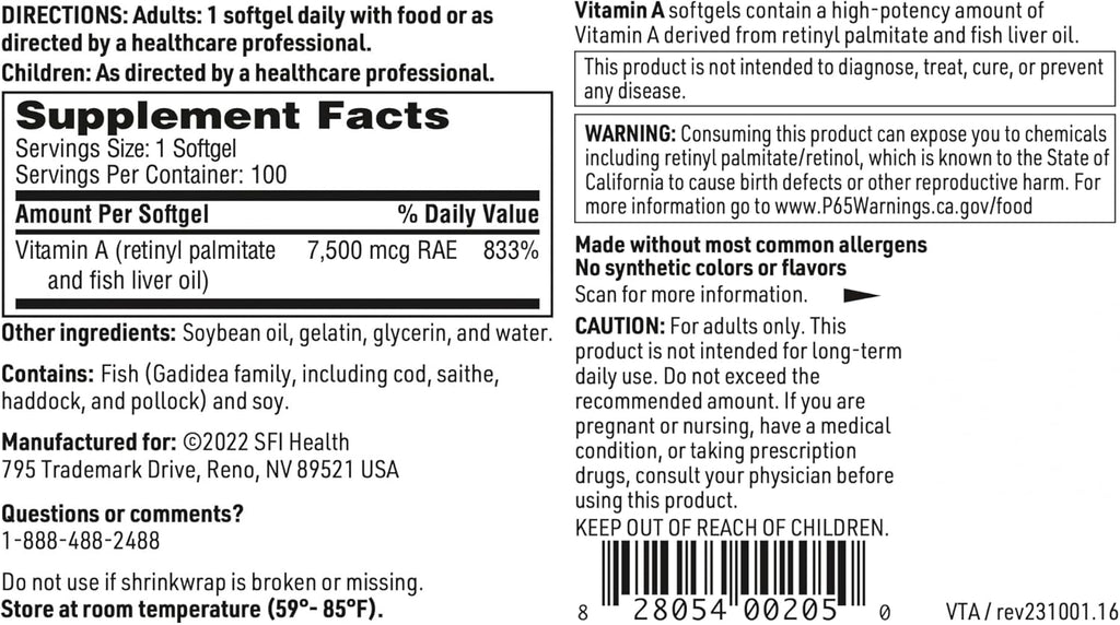 - High-potency 25,000 IU (7500 mcg RAE) of Vitamin A per softgel.