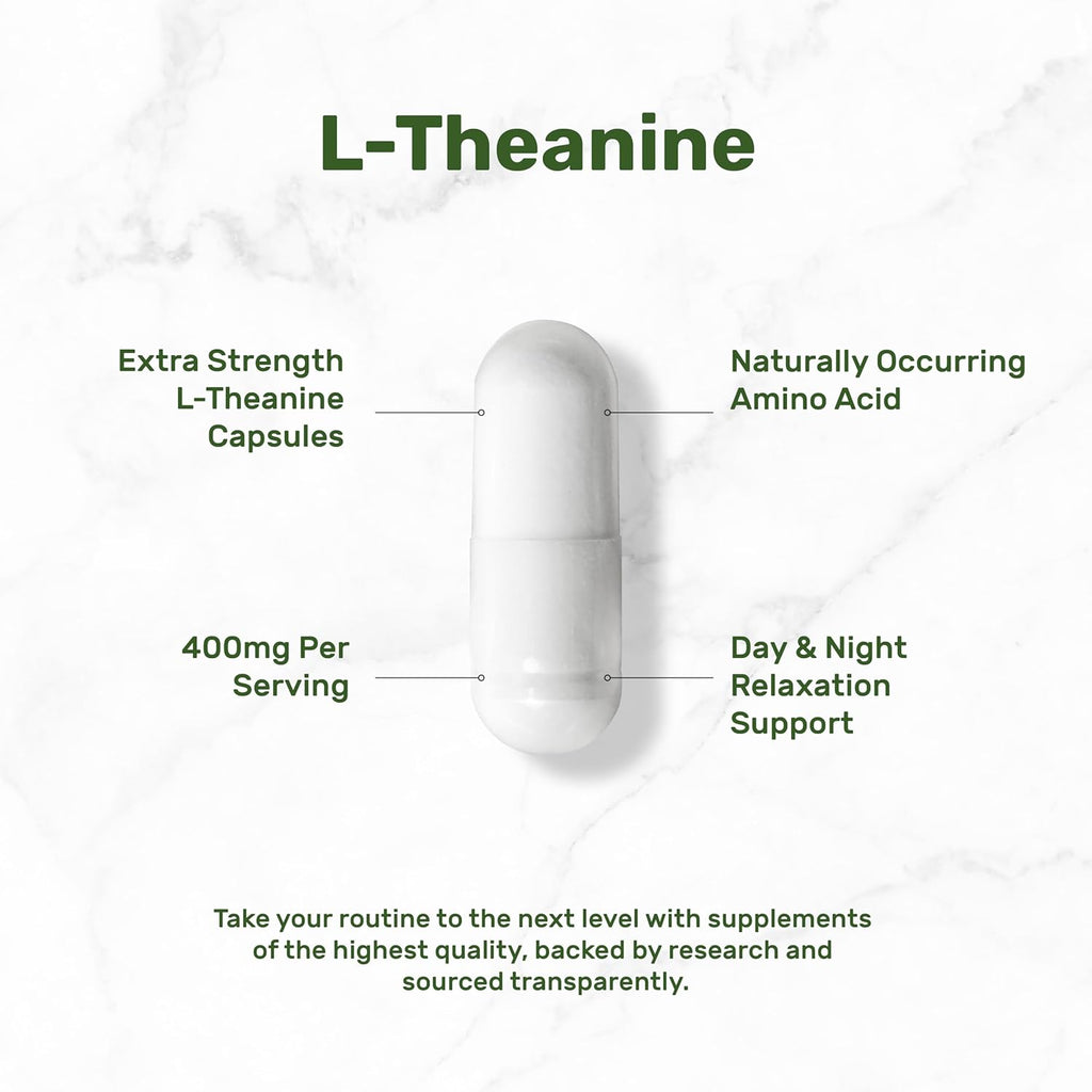 - Dosage & Servings – 400 capsules per bottle, offering 200 total servings, with each 2-capsule serving providing 400 mg of extra strength L-Theanine.