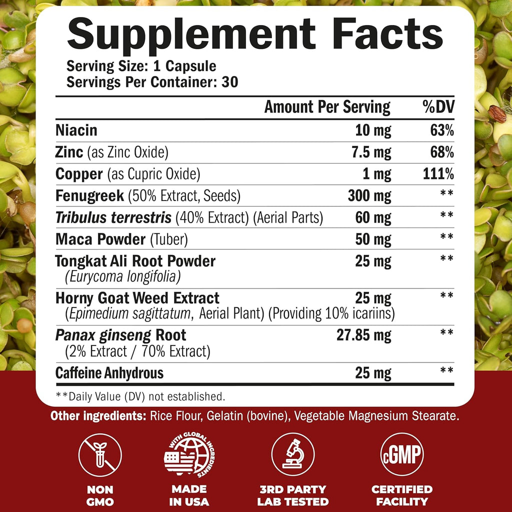 Niacin (10 mg), Zinc (as Zinc Oxide) (7.5 mg), Copper (as Cupric Oxide) (1 mg), Fenugreek (50% Extract, Seeds) (300 mg), Tribulus Terrestris (40% Extract, Aerial Parts) (60 mg), Maca Powder (Tuber) (50 mg), Tongkat Ali Root Powder (Eurycoma longifolia) (25 mg), Horny Goat Weed Extract (Epimedium sagittatum, Aerial Plant) (Providing 10% Icariins) (25 mg), Panax Ginseng Root (2% Extract / 70% Extract) (27.85 mg), and Caffeine Anhydrous (25 mg). Other ingredients: Rice Flour, Gelatin (Bovine), and Vegetable Magnesium Stearate.