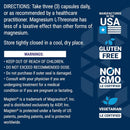 Take three (3) capsules daily with or without food, or as recommended by a healthcare practitioner. Magnesium L-Threonate has less of a laxative effect than other forms of magnesium.