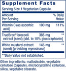 Vitamin C (as ascorbic acid) 100 mg TrueBroc® broccoli extract (seed) [std. to 10% glucoraphanin] 385 mg White mustard extract (seed) [providing myrosinase] 145 mg Other ingredients: maltodextrin, vegetable cellulose (capsule), microcrystalline cellulose, silica, vegetable stearate. Non-GMO TrueBroc® Produced under US patents 5,725,895; 5,968,505; 5,968,567; 6,177,122; and 6,242,018 licensed from Brassica Protection Products LLC; TrueBroc® is a trademark of Brassica Protection Products LLC.