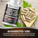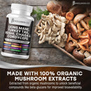 Lions Mane Mushroom (Hericium erinaceus 10:1 Extract) 300 mg (Equivalent to 3000mg of raw Lion’s Mane mushroom powder), Turkey Tail Mushroom (Trametes versicolor 10:1 Extract) 200mg (Equivalent to 2000mg of raw Turkey Tail mushroom powder) Reishi Mushroom (Ganoderma lingzhi 10:1 Extract) 100 mg (Equivalent to 1000mg of raw Reishi mushroom powder), Cordyceps Mushroom (Ophiocordyceps sinensis 10:1 Extract) 100 mg (Equivalent to 1000mg of raw Cordyceps mushroom powder), Chaga Mushroom (Inonotus obliquus 10:1 Extract) 100mg (Equivalent to 1000mg of raw Chaga mushroom powder), Marshmallow Root (Althaea officinalis 10:1 Extract) 60mg (Equivalent to 600mg of raw Chaga mushroom powder), Proprietary Blend: 350 mg: Maitake (Grifola frondosa) [Fruiting Body] Extract, Meshima (Phellinus linteus) [Fruiting Body] Extract, Poria Cocos (Wolfiporia extensa) [Fruiting Body] Extract, Shiitake (Lentinula edodes) [Fruiting Body] Extract, Tremella (Tremella fuciformis) [Fruiting Body] Extract, Oyster Mushroom (Pleurotus ostreatus) [Fruiting Body] Extract, Agaricus Mushroom (Agaricus bisporus) [Fruiting Body] Extract, Porcini (Boletus edulis) [Fruiting Body] Extract, Chanterelle (Cantharellus cibarius) [Fruiting Body] Extract, Enoki Extract (Enokitake, enokidake, futu, winter mushrooms, winter fungus), Morchella (True morels) [Fruiting Body] Extract, Sweet Tooth (Hydnum repandum) [Fruiting Body] Extract, Wood Hedgehog (Hydnum repandum) [Fruiting Body] Extract, King Trumpet (Pleurotus eryngii) [Fruiting Body] Extract, Buna Shimeji (Hypsizygus marmoreus) [Fruiting Body] Extract, Beech Brown (Hypsizygus tessulatus) [Fruiting Body] Extract, Clamshell Mushroom (Hypsizygus tessulatus) [Fruiting Body] Extract, Portobella (Agaricus bisporus) [Fruiting Body] Extract, Field Mushroom (Agaricus campestris) [Fruiting Body] Extract, Open Cap Mushroom (Agaricus bisporus) [Fruiting Body] Extract. Cellulose (Vegetable Capsule)