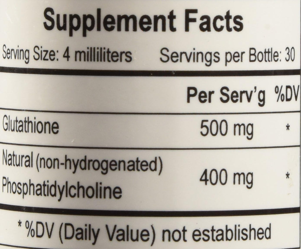 Liposomal Glutathione 4 fl oz (120 ml), Dietary Supplement, Suggested Use: 4 MILLILITERS DAILY (JUST UNDER ONE TEASPOON) OR AS DIRECTED BY YOUR PHYSICIAN. MIX INTO ONE OUNCE JUICE AS A PALATABLE WAY TO INGEST. Supplement Facts, Serving Size: 4 milliliters, Servings per Bottle: 30, Amount Per Serving, Glutathione 500 mg, Natural (non-hydrogenated) Phosphatidylcholine 400 mg, Other Ingredients: Purified water, natural flavors, potassium sorbate. Gently Shake Before Using. Keep Refrigerated and Use within 40 days of opening. Caution: As with all dietary supplements seek the advice of your qualified healthcare provider prior to use of this product. Pregnant or lactating women should consult their qualified healthcare provider prior to use.