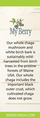 Support your wellness naturally with My Berry's Chaga Mushroom Extract Liquid (2oz), crafted from 100% wild-harvested chaga mushrooms and white birch bark. Sourced sustainably from living birch trees deep in the pristine forests of Maine, USA, and neighboring Atlantic Canadian woodlands, this powerful herbal tincture delivers optimal health-supporting compounds only found in truly wild chaga. Unlike cultivated versions, our whole chaga includes the potent black outer crust, rich in antioxidants and other beneficial compounds. We also include the white powdery layer of birch bark, a natural source of revered betulin, known for its immune-supporting properties. Our extract is double extracted using hot water and pure grain alcohol to ensure full-spectrum potency and bioavailability. Each 2oz glass bottle contains 28–56 servings (¼ to ½ tsp per serving) and is crafted with a 1:4 herb-to-solvent ratio and 30–40% alcohol content. Simple, clean, and crafted by a woman-owned small business, our Chaga Extract is free of fillers, additives, or anything we wouldn’t take ourselves. Add it to your daily wellness routine and feel the forest’s strength from the inside out.