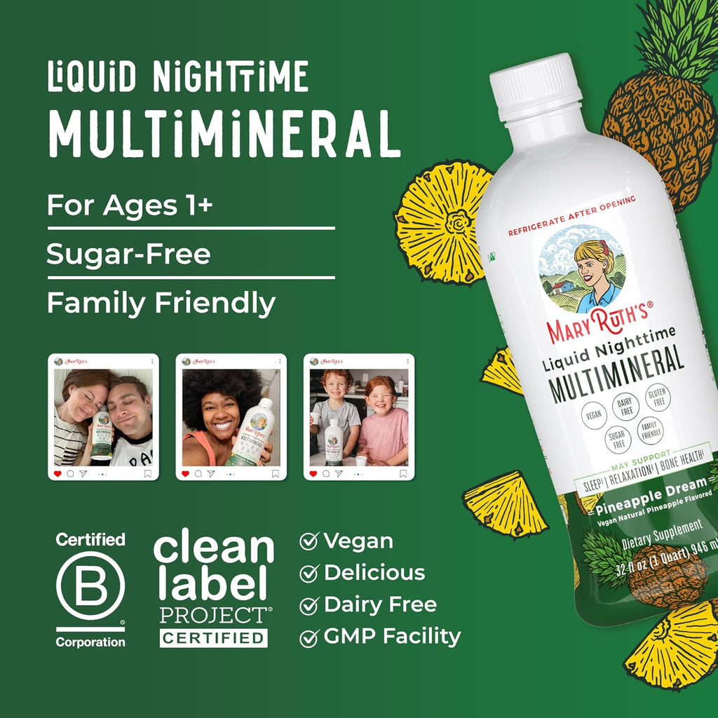 - For Most Lifestyles: MaryRuth's Liquid Nighttime Multimineral is Non-GMO, Vegan, Made in a GMP Facility. Melatonin Free, Dairy Free, Gluten Free, Sugar Free. Formulated for Adults and Kids. Clean Label Project Certified. B Corp Certified.