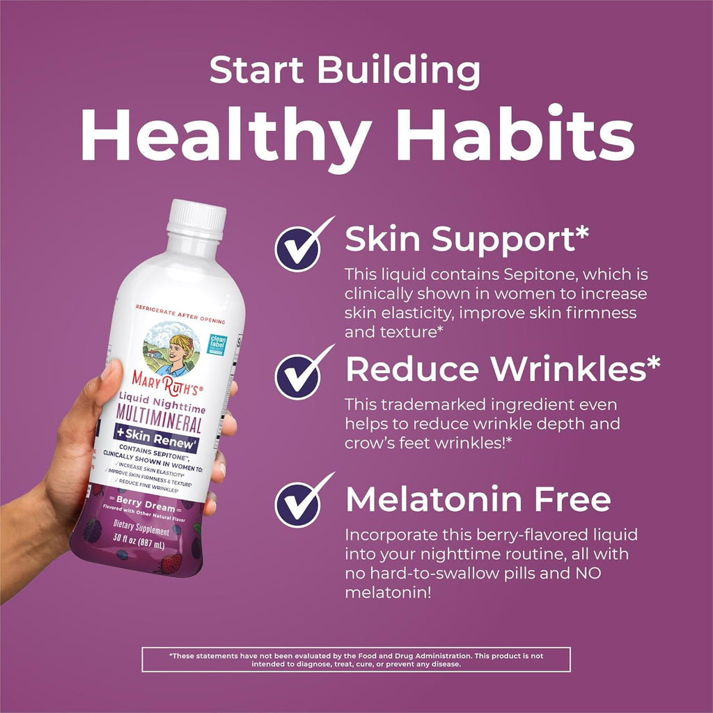 - For Most Lifestyles: MaryRuth's Liquid Nighttime Multimineral + Skin Renew is Non-GMO, Vegan, Made in a GMP Facility. Melatonin Free, Dairy Free, Gluten Free. Formulated for Adults 18+. Clean Label Project Certified. B Corp Certified.