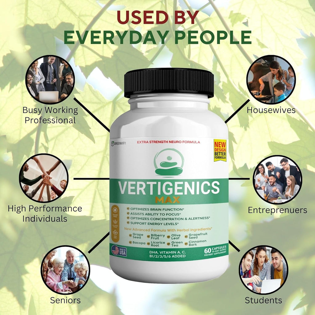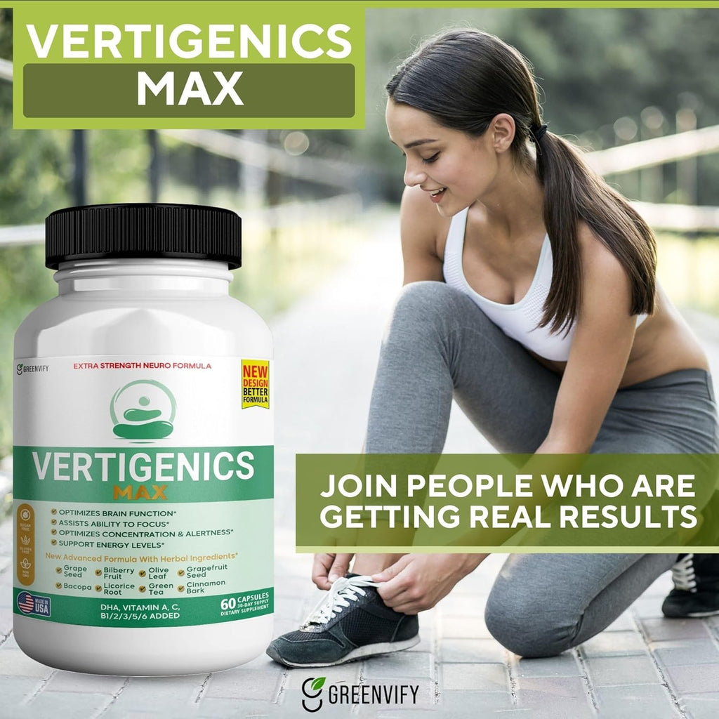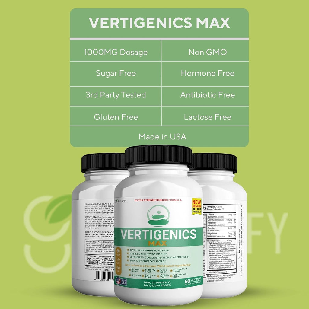 Vertigenics Max by GreenVify is a premium extra strength neuro formula crafted to support optimal brain health, focus, and mental energy. Whether you're tackling a demanding workday or studying for exams, this advanced supplement helps unlock your mental potential. Each serving delivers a full spectrum of essential vitamins including Vitamin A, C, D, E, and B-Complex , alongside vital minerals like Zinc, Magnesium, and Iron . The proprietary blend includes time-tested nootropic ingredients such as Bacopa Monnieri, DMAE Bitartrate, GABA, Green Tea Extract, Bilberry Fruit, and Huperzine A . Key Benefits: Enhances focus, concentration & alertness* Supports memory, clarity, and cognitive performance* Promotes healthy energy levels and brain metabolism* Formulated with herbal and nutritional ingredients known to nourish the brain* Free from gluten, sugar, soy, and GMOs. Manufactured in the USA under GMP standards. *These statements have not been evaluated by the Food and Drug Administration. This product is not intended to diagnose, treat, cure, or prevent any disease.