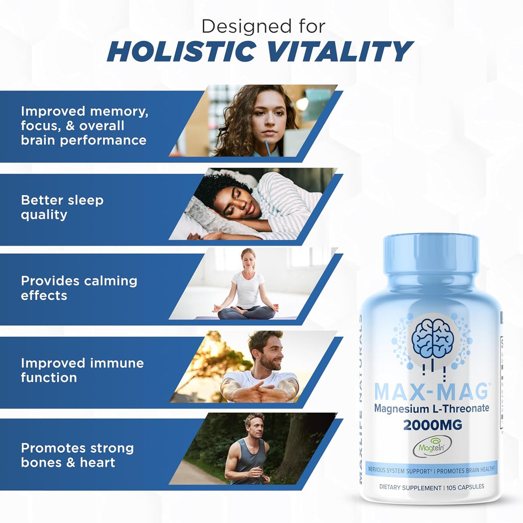 - SUPPORTS MENTAL CLARITY & FOCUS: With 2000mg of Magnesium L-Threonate Capsules (Magtein), MaxLife Naturals Max-Mag supplement- Magnesium L Threonate blend with Vitamin D3 and K2, crosses the blood-brain barrier to enhance mental sharpness, clear thinking, and attention. Ideal for busy professionals, it nourishes brain to help tackle daily tasks with ease. Achieve improved focus and memory while navigating your demanding lifestyle effortlessly with our Magnesium L Threonate supplement.