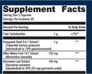 Total Carbohydrate (1 g), Fenugreek Seed (1000 mg), Bitter Gourd Fruit (152 mg), Gymnema Leaf (100 mg). Microcrystalline cellulose, gelatin, glycerin, silica, magnesium stearate, and croscarmellose sodium.
