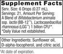 A Blend of Bifidobacterium animalis ssp. lactis (BB-12), Lactocaseibacillus rhamnosus (LGG). Other Ingredients: Sunflower oil, D-alpha-tocopherol, and citric acid.