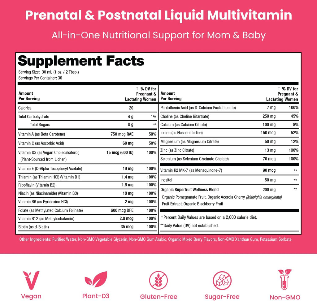 - Vegan Formula with Plant-Based D3, Folate & More - Our liquid prenatal vitamin complex contains a rich vitamin + mineral blend to support even plant-based and vegan diets. Cover your nutritional needs before, during and after pregnancy.