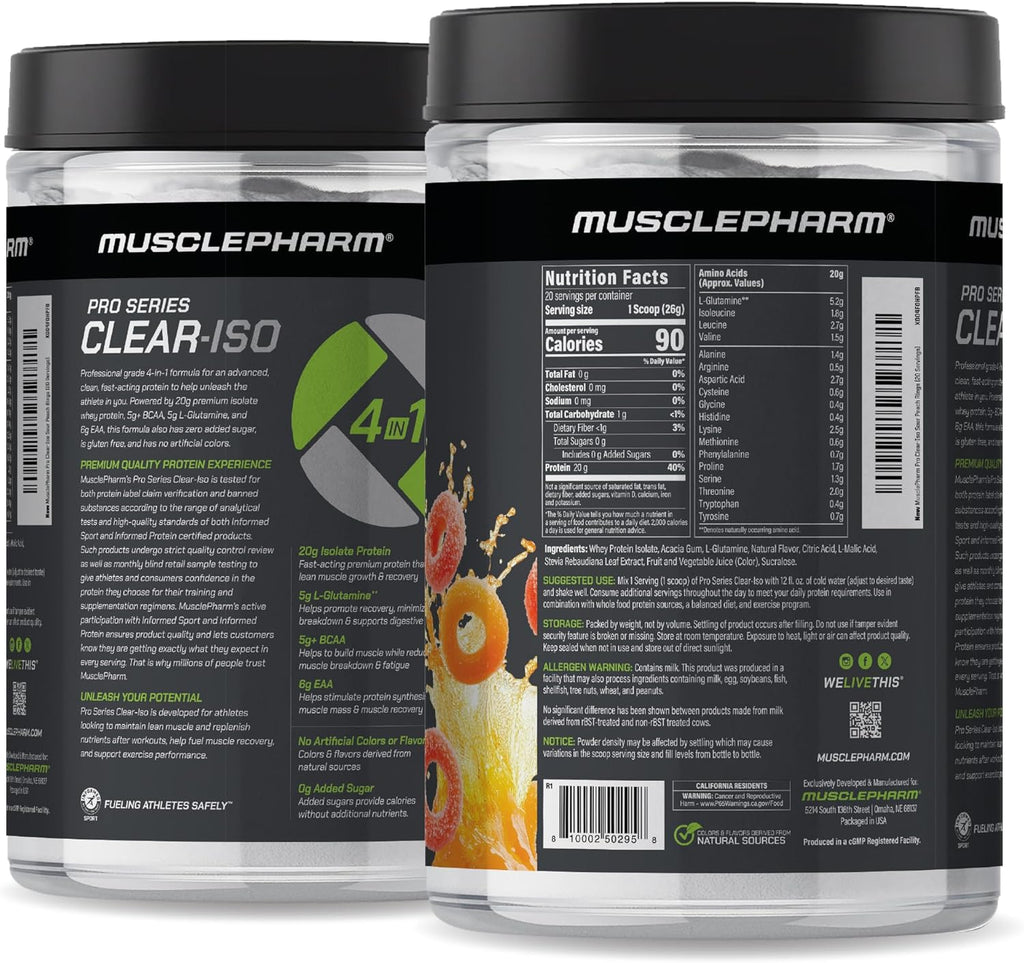 - Pro-Grade Clear Protein Powder: MusclePharm Pro Series CLEAR-ISO provides 20g fast-acting and ultra-pure whey protein isolate per serving, to support lean muscle growth, recovery, and pro-level performance—all in a refreshing clear high protein drink.