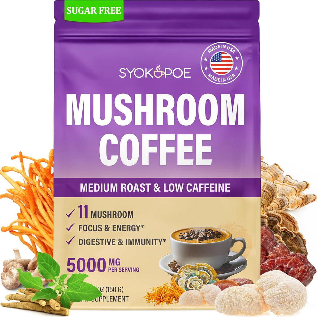 - 11 MUSHROOMS COFFEE BLEND: Our instant coffee powder is made from medium roasted Arabica coffee and contains 11 functional mushrooms. Experience Syokupoe mushroom coffee mixture (Lion's Mane, Reishi, Cordyceps, Chaga, Turkey Tail, Maitake, Shiitake, Pleurotus eryngii, White Fungus, Agaricus blazei, Willow Bracket) (100% fruiting body). It provides clean energy, focus, immune support, intestinal health, and creativity