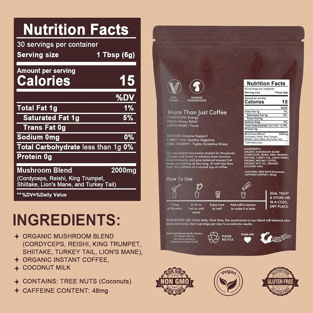 ORGANIC MUSHROOM BLEND(GORDYCEPS, REISHI, KING TRUMPET,SHITAKE, TURKEY TAIL, LION'S MANE)ORGANIC INSTANT COFFEE,ORGANIC MCT OIL, ORGANICCOCONUT MILK CONTAINS: TREE NUTS (Coconuts).CAFFEINE CONTENT:48MG PER SERVING