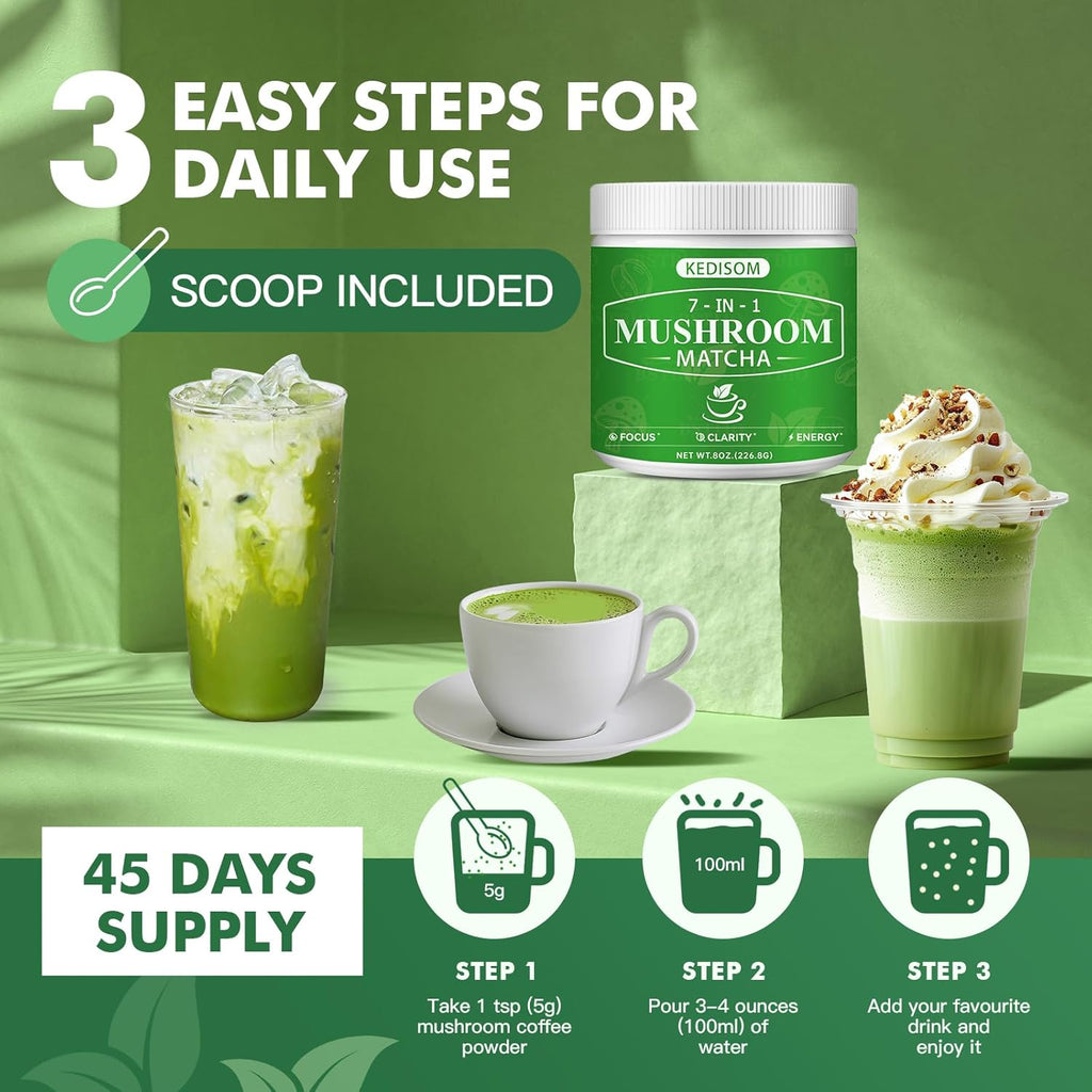 - Easy to Use: Mix 1 tsp of mushroom matcha powder in water, milk, or latte, or use in desserts for a tasty, nutritious treat. Enjoy a soothing cup of mushroom matcha tea anytime you need to recharge and refocus during your busy day!