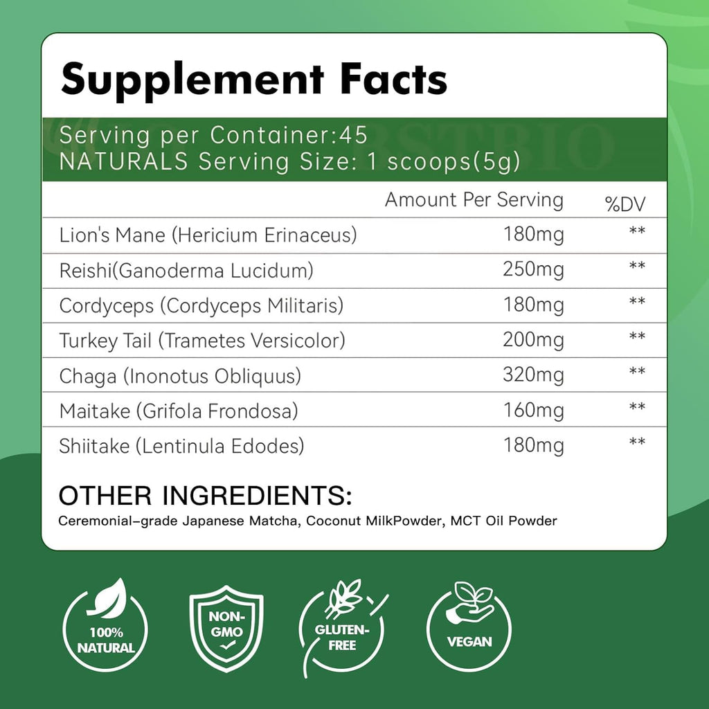 - All Nature: Using ceremonial-grade Japanese matcha, which has a premium taste, along with 7 types of mushrooms blended with matcha powder, ground to perfection for a smooth taste and rich in antioxidants.hailed as one of the highest sources of antioxidants on the planet, Matcha helps fight free radical damage, helps naturally rid the body of harmful components,Here to help your brain and body, with a mega-dose of antioxidants!