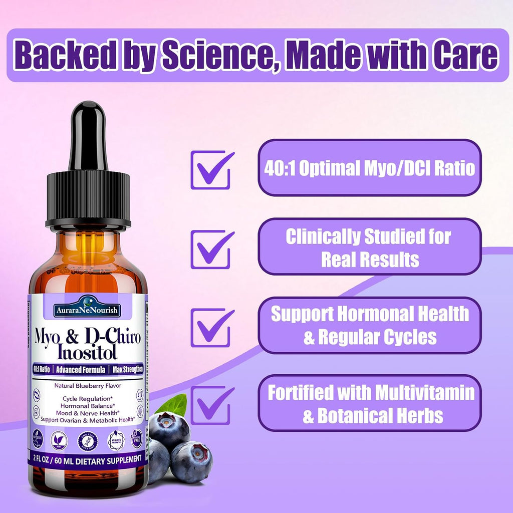 - 8-In-1 Advanced Myo-Inositol & D-Chiro Inositol Supplement for Women's Health: 8-In-1 myo & d-chiro inositol supplements for women are rich in 8 natural herbal active Ingredients. Just one dropper can enjoy the health brought by myo-inositol & d-chiro inositol, organic chaste tree berry, ceylon cinnamon, turmeric, passion flower extract, coenzyme-q10, inositol multivitamin. Each effective ingredient in our myo and d-chiro inositol supplement has been carefully selected based on its active effects on supporting hormonal balance for women, ovarian function, cycle regulation, fertility health*, mood, nerve & metabolic wellness*
