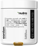 - EONION AGING & PERFORMANCE β NR increases NAD+ levels, enhancing cellular repair and mitochondrial function. CoQ10 boosts ATP production and protects cells from oxidative damage, reducing mitochondrial decline associated with aging. Shilajit further enhances CoQ10 absorption, optimizing energy production and antioxidant activity . This combination reduces age-related oxidative stress, supports cardiovascular health, and enhances endurance, promoting optimal aging and long-term vitality.