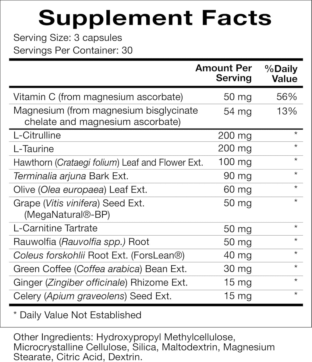 L-Citrulline, L-Taurine, Hawthorn (Crataegi folium) Leaf & Flower Ext.,Terminalia arjuna Bark Ext., Olive (Olea europaea) Leaf Ext., Magnesium bisglycinate chelate, Magnesium ascorbate, Grape (Vitis vinifera) Seed Ext., L-Carnitine, Coleus (Coleus forskohlii) Root Ext., Green Coffee (Coffea arabica) Bean Ext., Ginger (Zingiber officinale) Rhizome Ext., Celery (Apium graveolens) Seed Ext., Hydroxypropyl methylcellulose, microcrystalline cellulose, silica, maltodextrin, magnesium stearate, citric acid, dextrin.