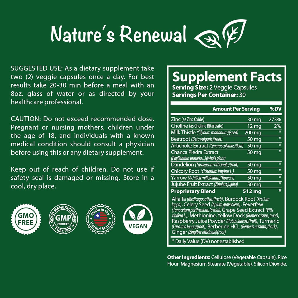 - HEALTHY GUT – Nature's Renewal Liver Support contains Yarrow, Dandelion Root, and Artichoke Extract, ingredients that aid in the production of bile and promote healthy digestion.
