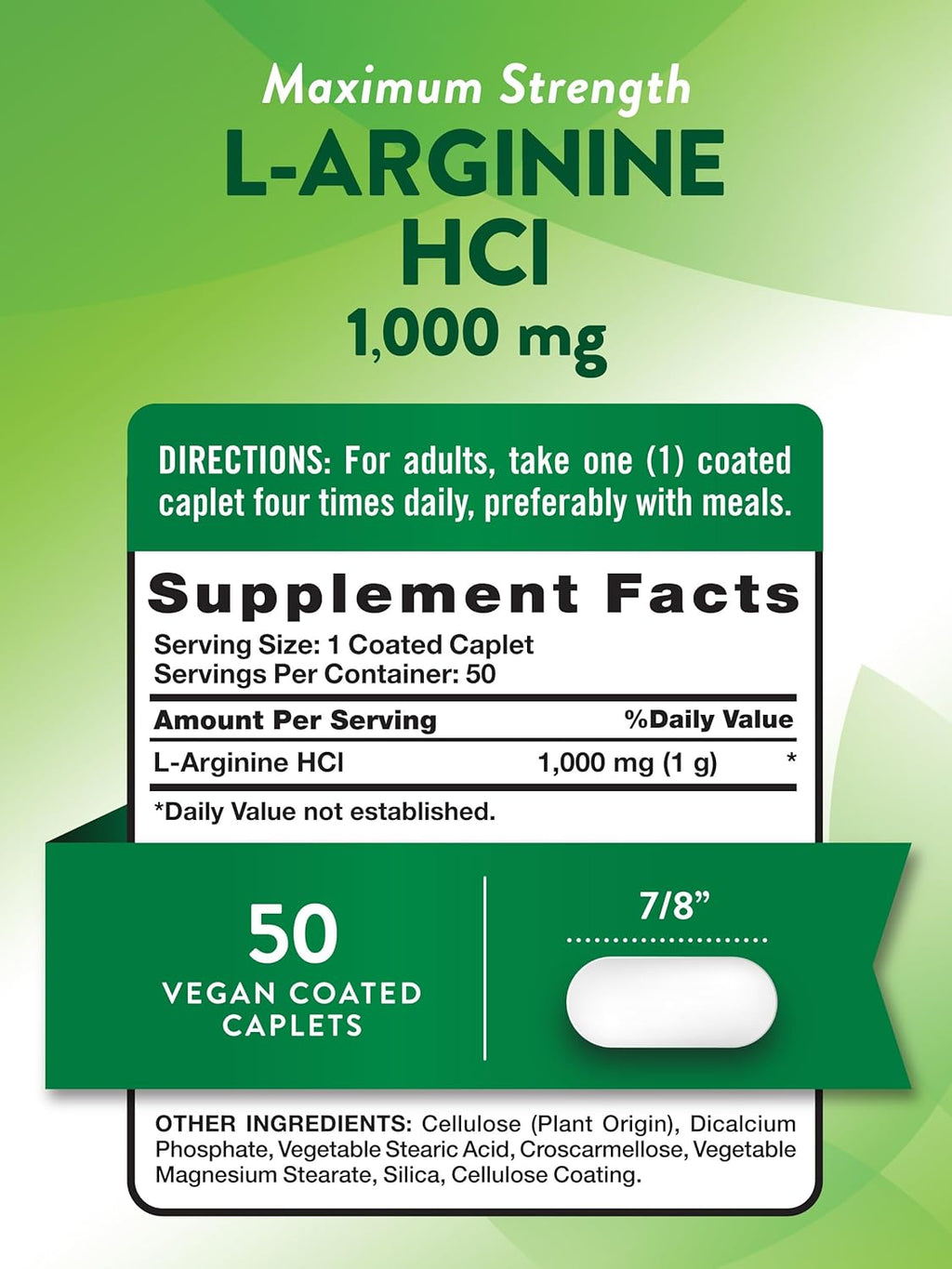 - MAXIMUM STRENGTH FORMULA: Each coated caplet delivers 1,000 mg of L-Arginine Hydrochloride