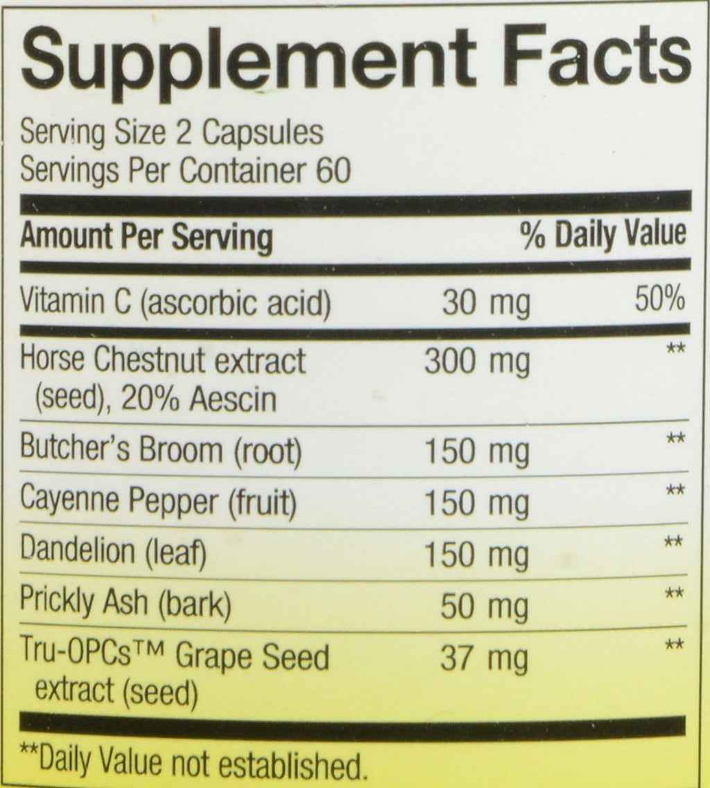 Vitamin C (ascorbic acid), Horse Chestnut Seed Extract standardized to 20% aescin (60 mg), Butcher's Broom (root), Cayenne pepper (fruit), Dandelion (leaf), Northern Prickly Ash (bark), Tru-OPCs Grape Seed Extract, plant-derived capsule (hypromellose), cellulose, magnesium stearate