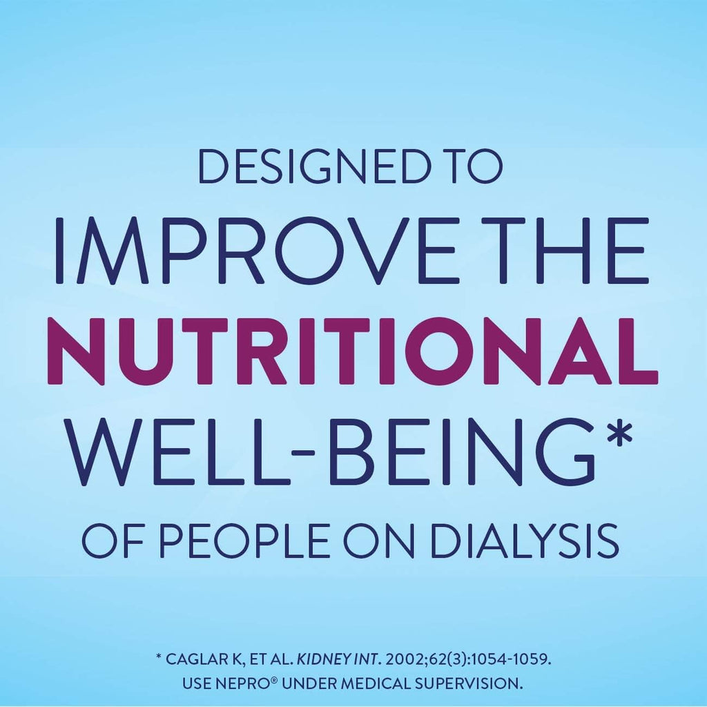 Nepro nutrition shakes are specially designed to help meet the nutrition needs of people on dialysis. One serving has 19 grams of protein and 420 nutritious calories to help replenish nutrients lost due to dialysis. It's low in potassium and phosphorus for patients with kidney disease. It tastes great cold and comes in three delicious flavors—Homemade Vanilla, Butter Pecan, and Mixed Berry. Reference: 1. Caglar K, et al. Kidney Int. 2002;62(3):1054-1059.