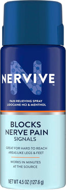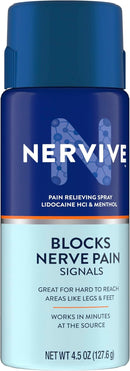 "NERVIVE PAIN RELIEVING SPRAY comes from the MAKERS OF THE WORLD'S #1 NERVE CARE BRAND†, developed with over 50+ years of global expertise in nerve care. NERVIVE PAIN RELIEVING SPRAY blocks nerve pain signals by targeting nerve pain receptors to RELIEVE PAIN WITHIN MINUTES so you can continue living your life the way you want to. Enjoy a non-greasy, soothing relief experience. NERVIVE PAIN RELIEVING SPRAY starts WORKING IN MINUTES to BLOCK NERVE PAIN SIGNALS thanks to maximum strength levels of Lidocaine HCL and Menthol. Feel FAST-ACTING RELIEF and continue doing the things you love and spending time with loved ones. FEEL THE DIFFERENCE with NERVIVE PAIN RELIEVING SPRAY Also available: NERVIVE PAIN RELIEVING LARGE ROLL ON with a no-mess roll-on applicator and NERVIVE PAIN RELIEVING LARGE CREAM for a non-greasy, soothing relief experience. Try NERVIVE NERVE RELIEF, containing ALA, which reduces occasional nerve discomfort in as little as 7 days ‖*. Also available in PM to support your sleep experience."