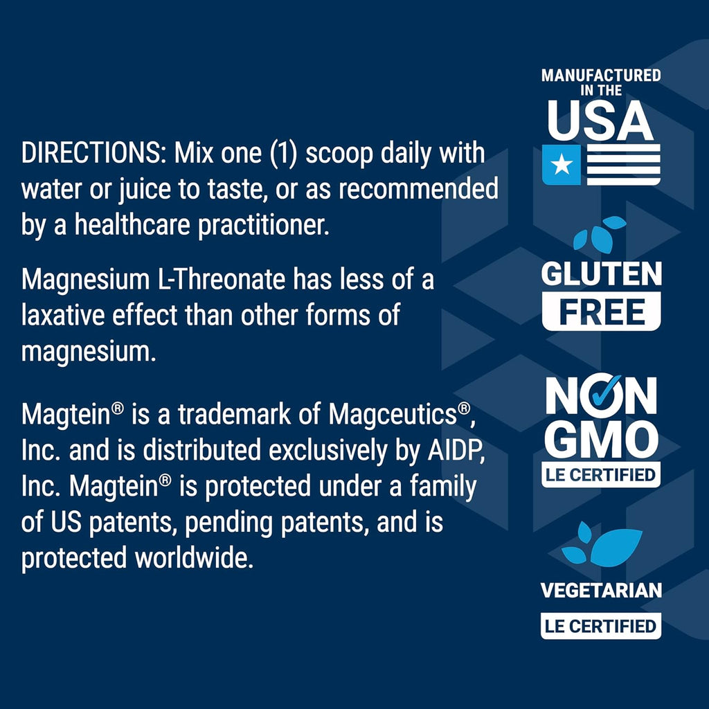 Mix one (1) scoop daily with water or juice to taste, or as recommended by a healthcare practitioner. Magnesium L-Threonate has less of a laxative effect than other forms of magnesium.