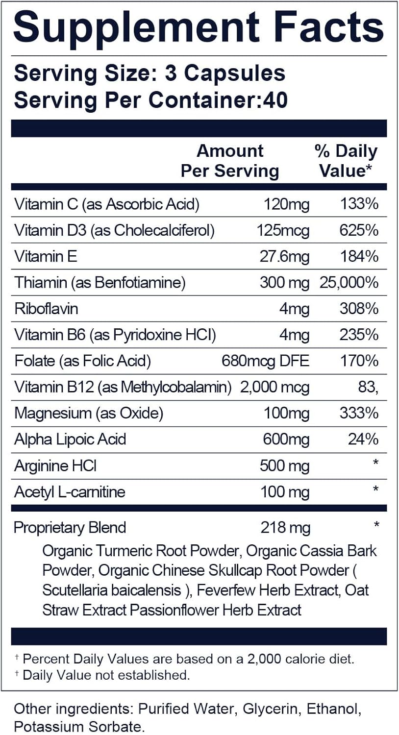 - Alpha Lipoic Acid 600 mg, Thiamin as Benfotiamine, Vitamins B12 & B6, Vitamin C, Vitamin E, Vitamin D, Acetyl L-Carnitine, Curcumin, and Magnesium