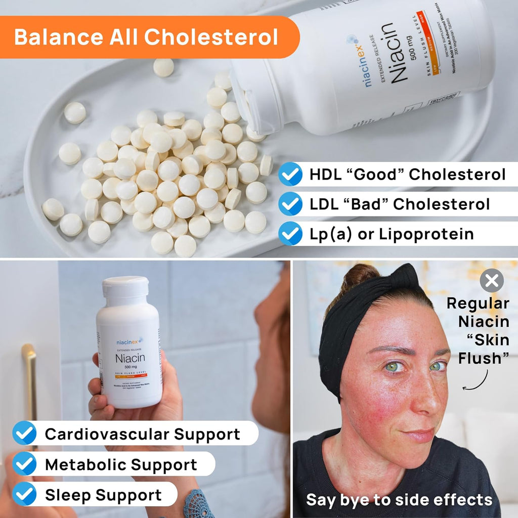 - Minimal to No-Flush Formula - Niacinex is a sustained time release 500mg nicotinic acid tablet created with a low to no-flush wax matrix composition. This means you get all of the cardiovascular advantages of time release niacin without the unpleasant skin flush that other supplements can cause.
