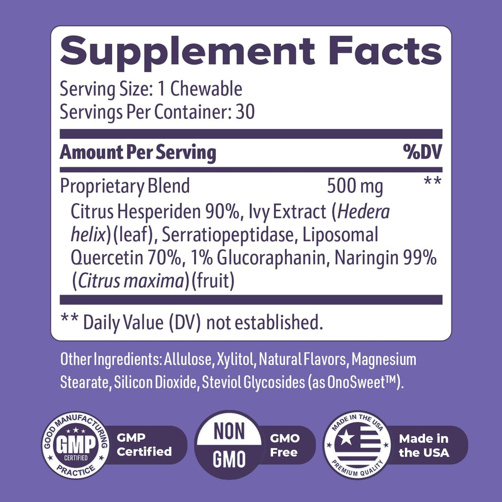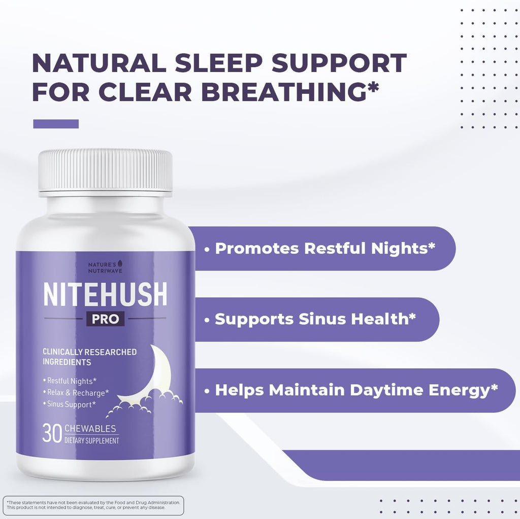 NiteHush Pro is a nighttime wellness chewable designed to support restful evenings using a thoughtful combination of citrus extracts, enzymes, and plant-derived compounds. It’s formulated to complement your evening routine with a smooth, gentle experience—ideal for those seeking balance before bedtime. Each chewable tablet delivers a 500 mg proprietary blend including Citrus hesperiden (90%), ivy leaf extract, serratiopeptidase, liposomal quercetin, glucoraphanin, and naringin (from Citrus maxima). These ingredients are carefully selected to work together as part of a calm, evening-focused supplement NiteHush Pro is sweetened naturally with allulose, xylitol, and steviol glycosides, offering a clean taste without added sugars or artificial sweeteners. With no stimulants and no habit-forming ingredients, it's a gentle option for consistent nighttime use. Manufactured in a GMP-certified facility in the USA, NiteHush Pro is non-GMO, free from harsh fillers, and simple to take. Whether you’re looking for a natural nighttime addition or something to ease into quiet evenings, this chewable offers an easy, pleasant experience to round out your wellness routine