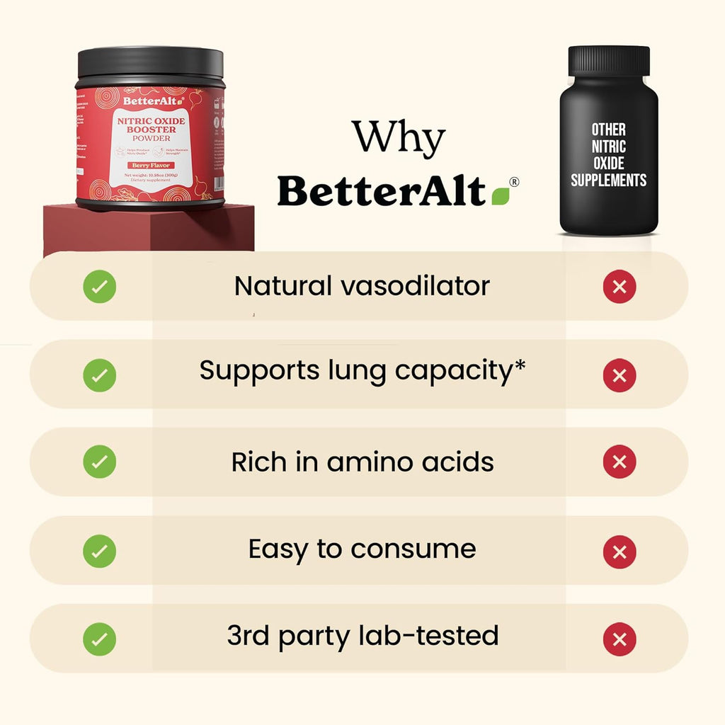 - Clean & Safe Ingredients – Free from artificial additives and unnecessary fillers, BetterAlt Nitrix Oxide Booster is crafted with premium, natural ingredients to ensure a clean, safe, and effective supplement.