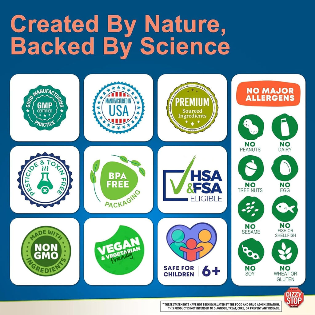 - MADE IN THE USA: Rigorously tested in an American cGMP-certified facility, Dizzy Stop ensures quality, purity, and potency in every batch. Great for those seeking easy-to-swallow tablets, our non-GMO formula offers balance support for temporary forms of vertigo like BPPV and stops motion sickness in its tracks.
