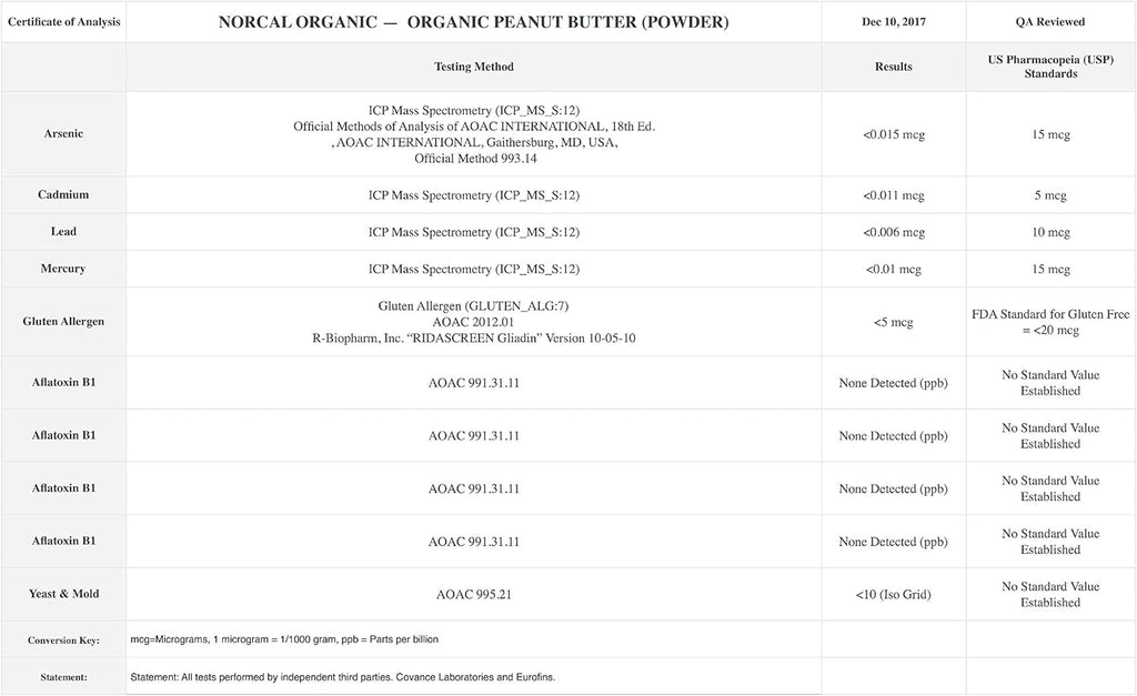 NorCal Organic Peanut Butter Protein starts with organic Spanish variety peanuts grown on Southwest Texas family farms. The dry conditions of Southwest Texas create the ideal growing environment for organic peanuts. The peanuts are harvested, lightly roasted, and 100% mechanically processed without the use of solvents to create a vegetarian/vegan friendly powder with 11 grams of protein and 4 grams of fiber per serving. Like all of NorCal Organic's products, our peanut butter protein is tested by independent labs for impurities, including heavy metals and aflatoxin. NorCal Organic is committed to working with farmers who practice and support organic and sustainable farming and animal welfare.