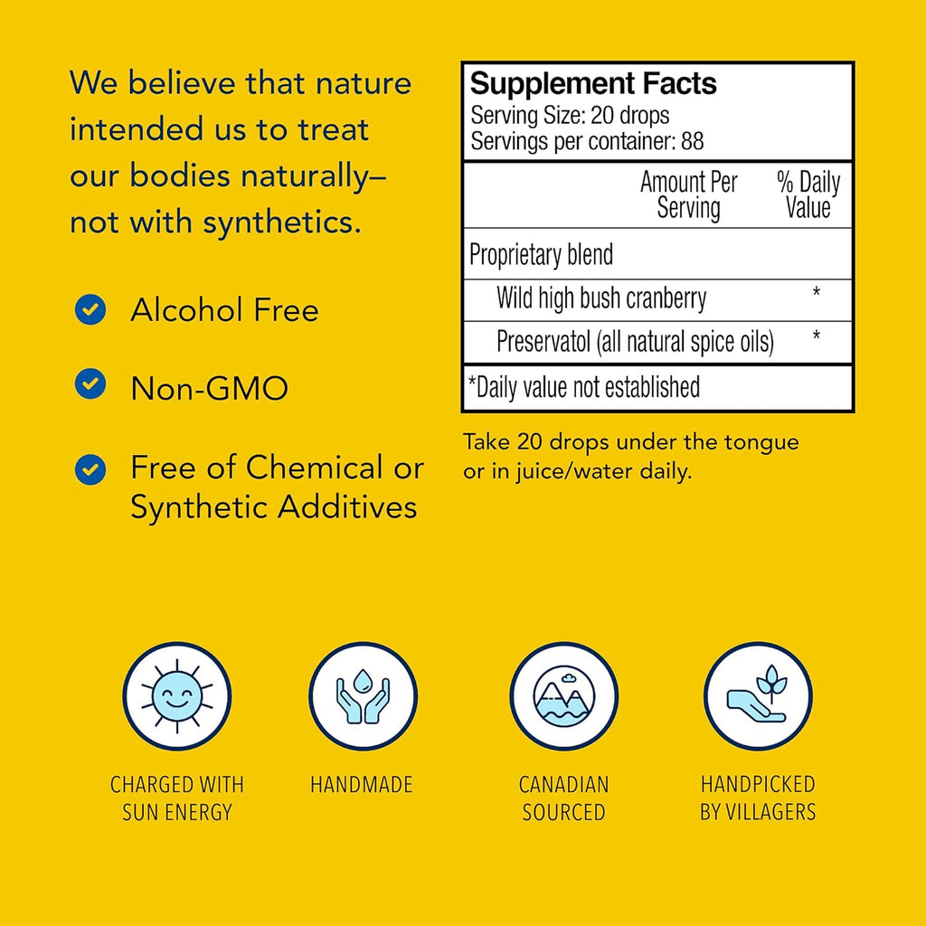 Proprietary blend Amt Per Serving: % Daily Value :N/A,Wild high bush cranberry Amt Per Serving: % Daily Value :N/A,Presveratrol (all-natural spice oils) Amt Per Serving: % Daily Value :N/A,Daily value not established.,
