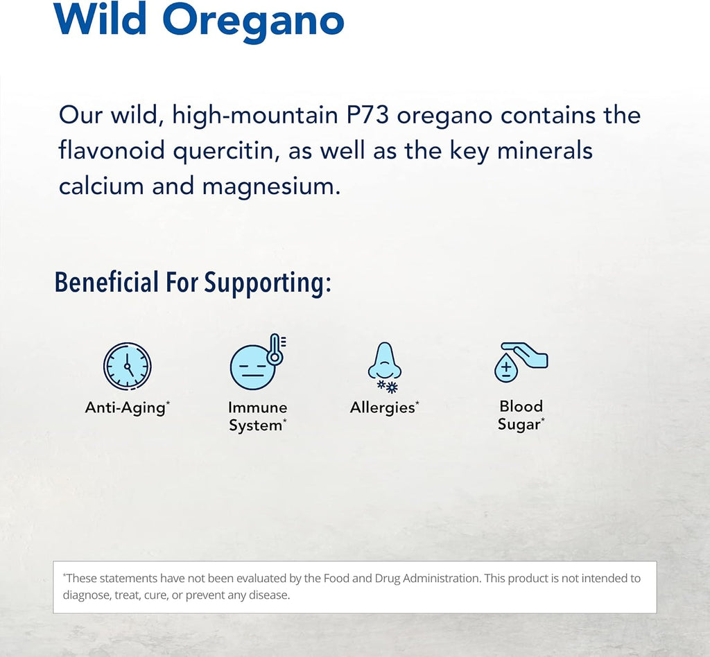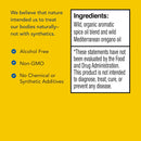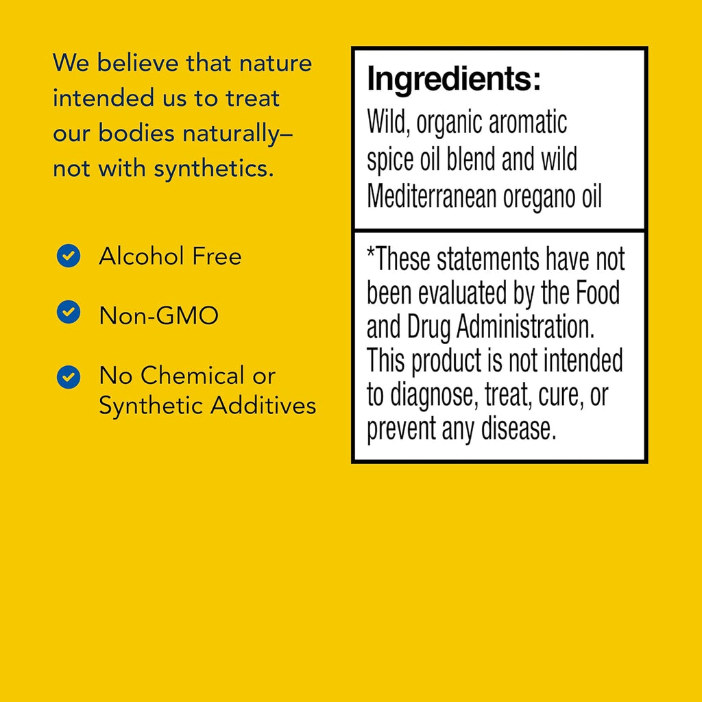 - Full Ingredient List; Wild, organic aromatic spice oil blend, wild Mediterranean oregano oil; Free of all chemicals, pesticides & additives; Non-GMO