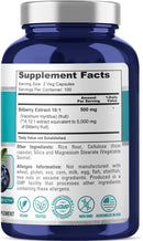 - Bilberry Extract 5,000mg per serving 200 Capsules Per Bottle & a 100-Day Supply