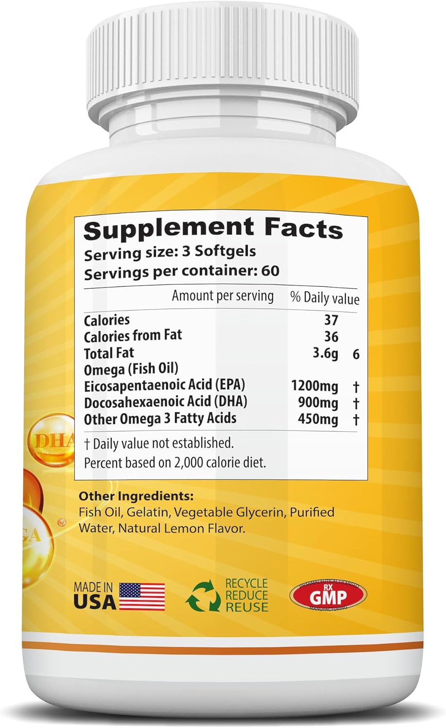 - ULTRA HIGH POTENCY & PURITY: Experience the power of a high-potency 3750mg fish oil supplement, providing 1200mg of EPA and 900mg of DHA per serving—far beyond standard fish oils. Using advanced molecular distillation, our fish oil is purified to remove heavy metals, toxins, and other harmful substances, ensuring 100% safety and quality for your health. Feel confident knowing you’re getting a pure, ultra-strength supplement.