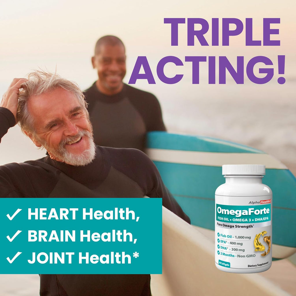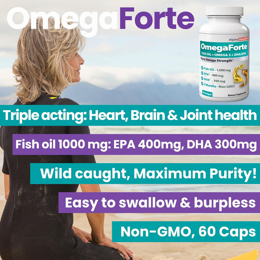 - OmegaForte Naturals Ultimate Omega 3 Fish Oil Supplements for Women & Men, Omega 3 Fish Oil 1000 mg, EPA 400 mg, DHA 300 mg. Heart, Brain & Eye Health. Purified, Burpless, 60 days Supply Non GMO