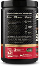 Optimum Nutrition GOLD STANDARD 100% WHEY Protein powder supports muscle and post-workout recovery with 24g of quality protein, gluten free with 5.5g of naturally occurring BCAAs and 11g of naturally occurring EAAs per serving to support muscle recovery. ON's Gold Standard Whey is Banned Substance Tested so you can trust the protein powder you are consuming! It’s crafted to be a complete, fast-digesting protein with whey protein isolate as the primary source – a filtered form of whey that can support protein goals for people at every level of fitness – from daily runners and gym-goers to competitive strength athletes and everyone in between. With great-tasting flavor options, satisfying texture, and easy mixing with only a glass and spoon, you’ll always look forward to getting the protein you want in your active, performance-driven lifestyle. Try using Gold Standard Whey in your favorite recipes to plus-up your protein intake! It’s everything you’ve come to expect from OPTIMUM NUTRITION: The World’s #1 Sports Nutrition Brand.