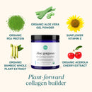 - Vegan Collagen Builder: Aloe Gorgeous is an organic and vegan collagen-boosting powder. It’s an organic blend of aloe vera, protein, silica, and vitamins C and E to help support your body’s production of collagen. No animal collagen required!