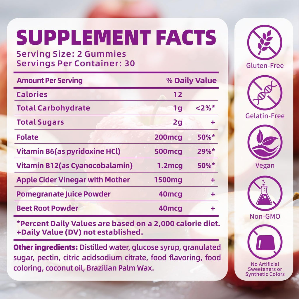 - Energy-Boosting B12, Beetroot & Folate Gummies | Loaded with Vitamin B12, Beet Root, and Folate, these gummies are scientifically formulated to enhance energy and vitality. Combined with Apple Cider Vinegar, Vitamin B6, and Pomegranate, they provide essential nutrients for a well-balanced, active lifestyle. A delicious way to fuel your day naturally!