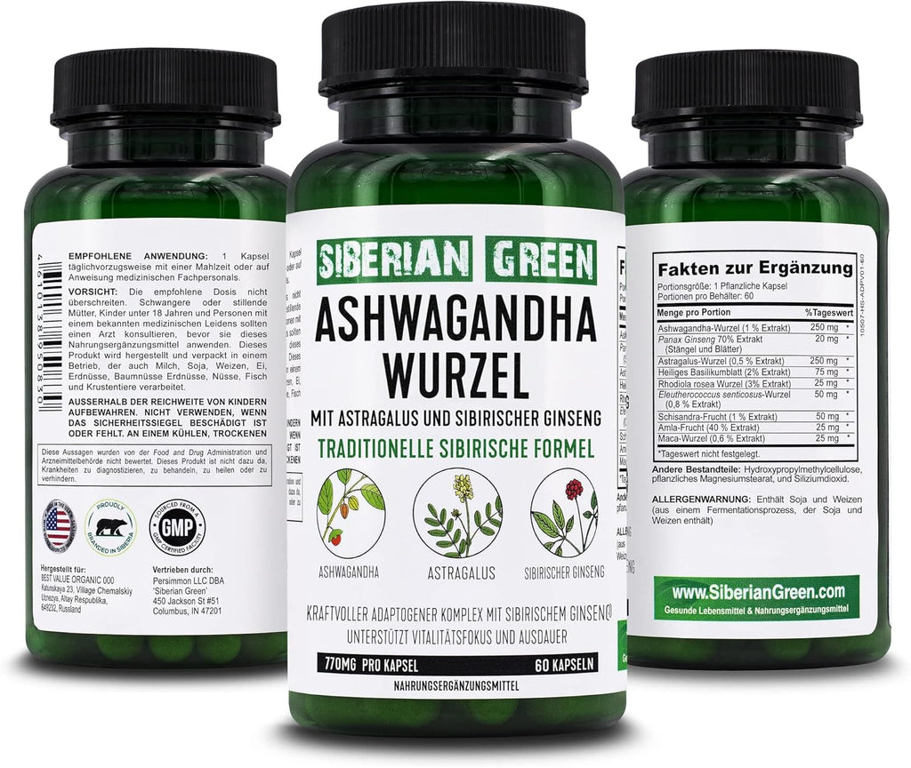 Siberian Green Organic Ashwagandha Root with Astragalus & Siberian Eleuthero Ginseng Complex 60 Capsules Powerful Herbal Support