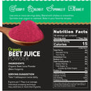 - Our premium beet juice powder is an intense form of pure beet juice powder with a high content of naturally occurring nitric acid for extra energy. This unique formula is crafted with cold-pressed and water-soluble organic beets, giving you an immediate burst of energy to give you the vigor to get through your day.