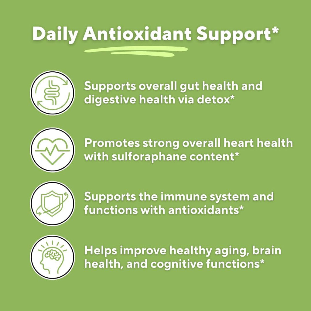 - ABOUT OUR BROCCOLI SPROUT CAPSULES — Our Broccoli Sprout Supplement features a powerful blend of Broccoli Sprout Powder and Broccoli 4:1 Extract in easy-to-take veggie capsules. Designed to support antioxidant and sulforaphane intake, this formula helps promote skin health, heart health, and cognitive function.* Convenient for daily use, it’s an effortless way to enjoy the benefits of broccoli without the taste!