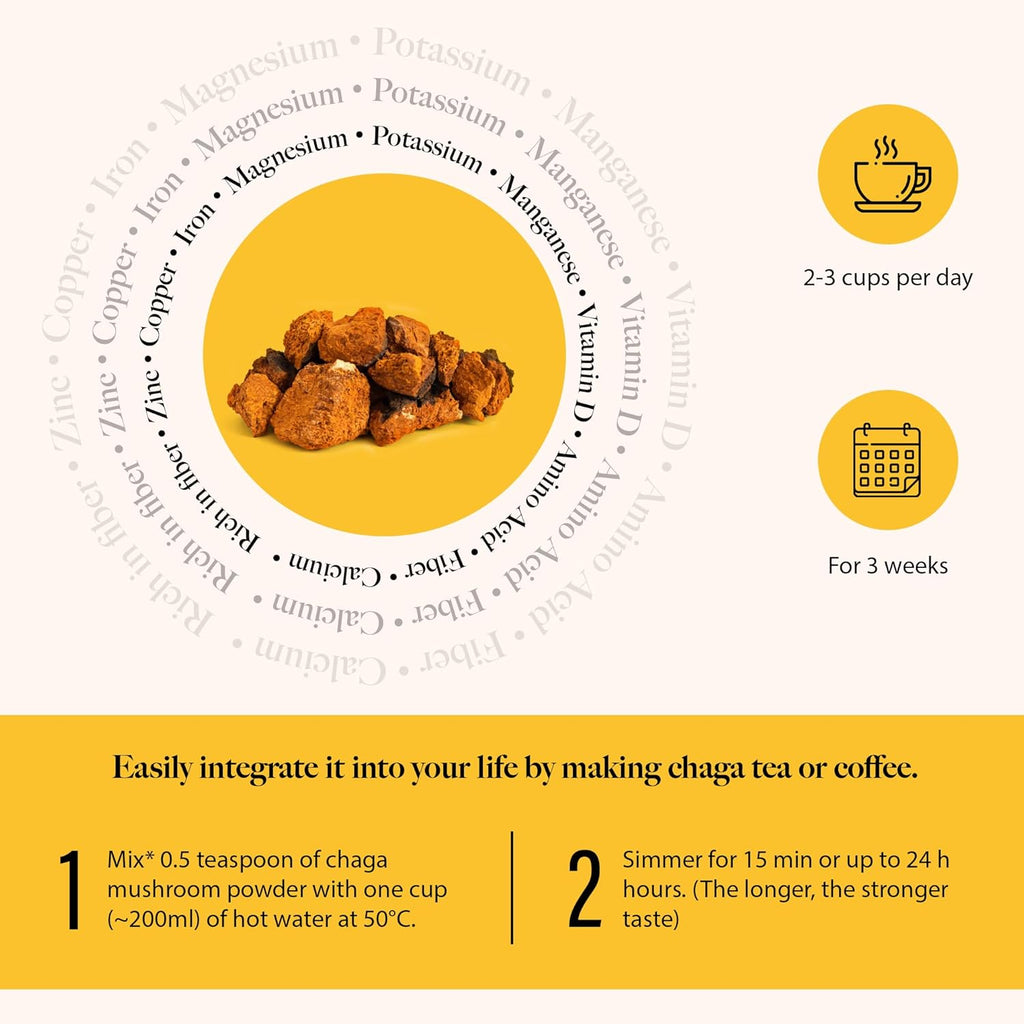 - Benefits of Chaga Mushrooms: Chaga mushrooms are traditionally used to reduce tiredness and sharpen mental focus. For best results, incorporate this organic mushroom powder into your daily routine.