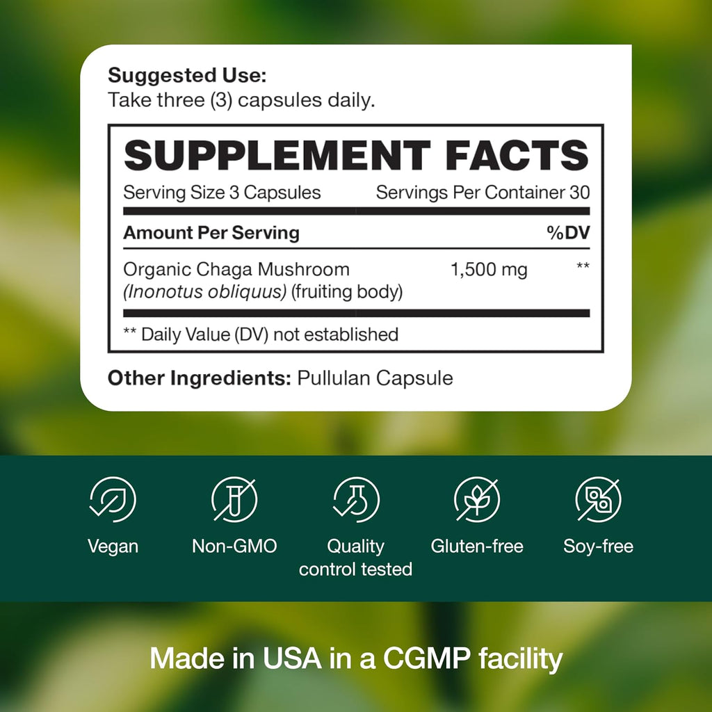 - Each bottle contains 90 Capsules of Organic Chaga Mushrooms, providing 1500mg of pure DNA Verified ingredients per serving, with a breakdown of 500mg per capsule. Lasts one month at 3 capsules a day.