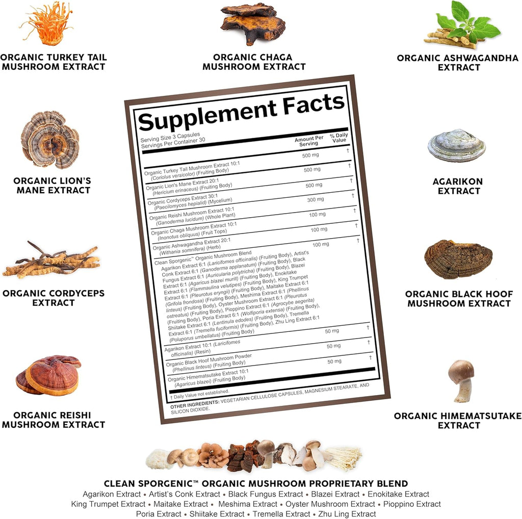 - Organic Mushroom Supplement: Crafted to support your wellness journey with organic ashwagandha powder, agarikon supplement, turkey tail mushroom extract, shiitake mushroom powder, cordyceps capsules, chaga mushroom, tremella mushroom extract, organic reishi mushroom powder, black hoof mushroom extract and lions mane powder. With just 3 capsules a day, you can reap the benefits of Sporgenic organic mushroom powder supplement.